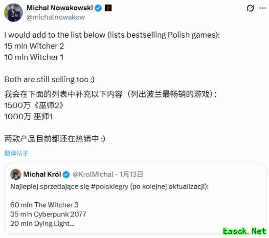 CD Projekt Red 的首席执行官 Michal Nowakowski 在一份最受欢迎的波兰电子游戏榜单中公布了整个《巫师》系列的销量数据。
