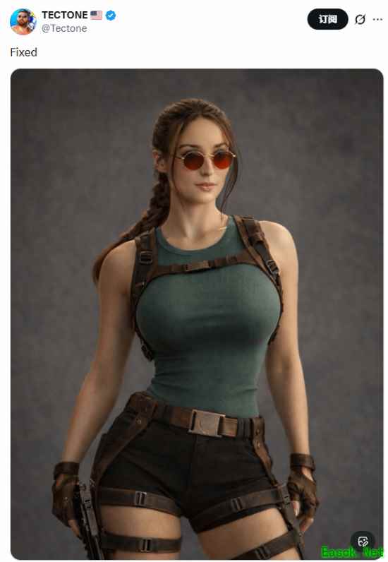 玩家 “TECTONE” 发布的修改版定妆照,通过 AI 调整让劳拉的身材更贴合游戏中 “前凸后翘” 的标志性特征,配文 “Fixed(修复了)”。这一内容迅速获得大量玩家共鸣: