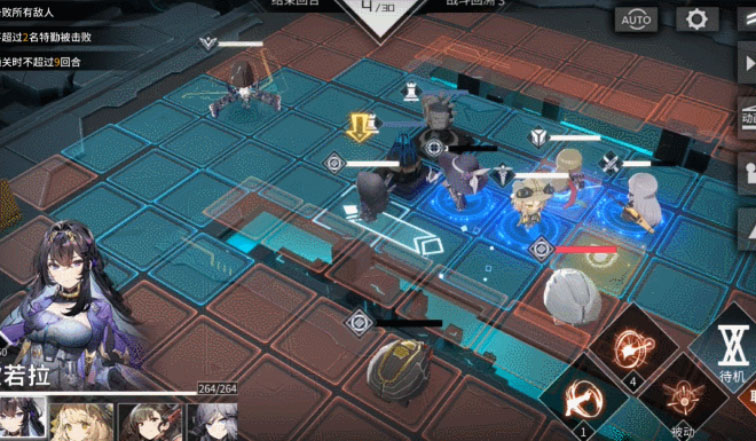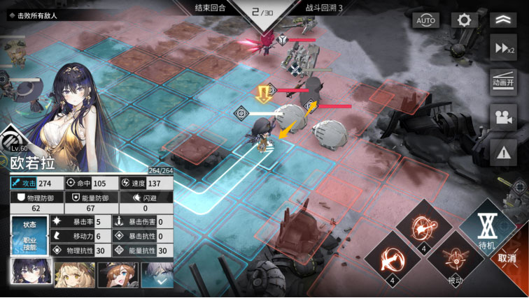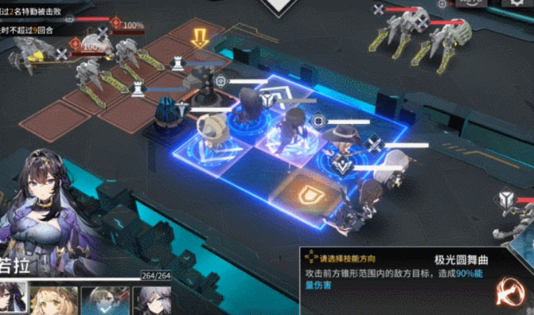 但是这里也有一个需要随机应变的地方。欧若拉的被动需要和队友形成夹击后才能提升攻击,那么欧若拉一般就是要等队友到达位置之后再移动才能在当前的回合中,吃到30%的加成。所以移动前进单位之前,要先看看欧若拉能不能形成夹击,不能形成就别太靠前。