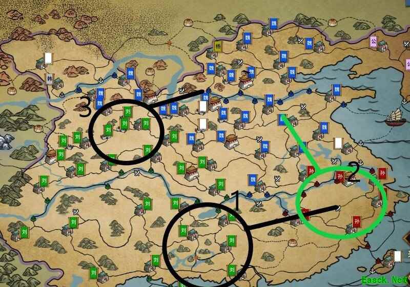 逐步扩充兵力后,攻占城池并集中于黑圈位置,先征讨孙权,再进攻曹操,稳步推进统一进程。