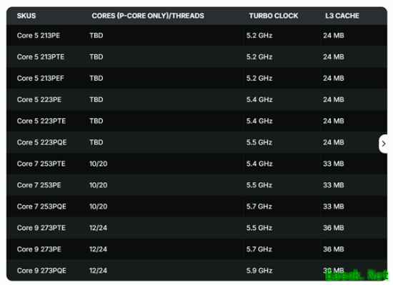 频率从最慢的酷睿5 213PE开始,其频率为5.2 GHz,一直到旗舰芯片酷睿9 273PQE,频率高达5.9GHz。