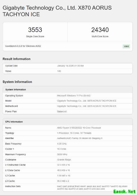 在最新的Geekbench 6测试中,9950X3D2跑出了单核3553分、多核24340分的优异成绩,相比于单CCD缓存版本的9950X3D,其综合性能提升了约7%。
