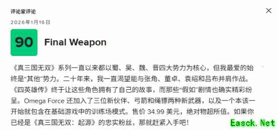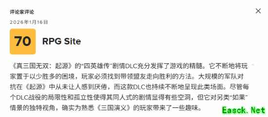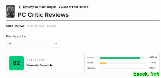 光荣特库摩旗下《真三国无双:起源》DLC“梦幻四英杰”即将于1月22日正式发售,媒体评分现已解禁。截止至发稿时,评分网站Metacritic共收录了7家媒体的评测,其中6家媒体给予好评,剩下一家给出中评,均分为82分!