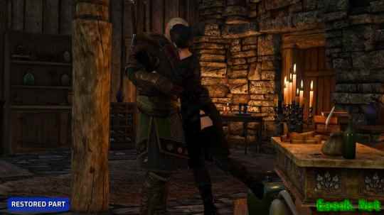 此外,模组还还原了任务结尾杰洛特与叶奈法牵手的温馨画面,并为该任务新增额外对话。还原内容远不止于此,还包括:希里与狂猎战士的附加对话场景、杰洛特返回凯尔莫罕后与艾斯凯尔的新增对话,以及在“血腥男爵”任务中曾被删除的、允许玩家明确表达是要杀死还是解除尸婴诅咒的选项。据推测,最后一项改动因不影响任务最终走向而在原版中被删除。