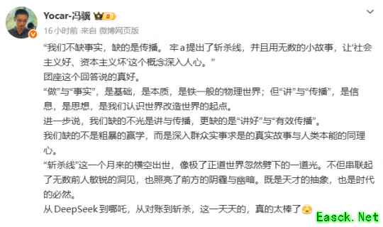 “我们不缺事实,缺的是传播。 牢a提出了斩杀线,并且用无数的小故事,让‘社会主义好、资本主义坏’这个概念深入人心。”团座这个回答说的真好。“做”与“事实”,是基础,是本质,是铁一般的物理世界;但“讲”与“传播”,是信息,是思想,是我们认识世界改造世界的起点。进一步说,我们缺的不光是讲与传播,更缺的是“讲好”与“有效传播”。我们缺的不是粗暴的赢学,而是深入群众实事求是的真实故事与人类本能的同理心。“斩杀线”这一个月来的横空出世,像极了正道世界忽然劈下的一道光。不但串联起了无数前人敏锐的洞见,也照亮了前方的阴霾与幽暗。既是天才的抽象,也是时代的必然。从DeepSeek到哪吒,从对账到斩杀,这一天天的,真的太棒了