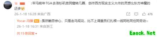 评论区有网友调侃道:“冯骥前年去TGA有没有去洛杉矶贫民窟转几圈,创作西方现实主义大作的灵感比东方神魔的还多。”冯骥则幽默回应道:“虽然触目惊心,只是走马观花,比不上调查员们扎根一线同吃同住同劳动~”