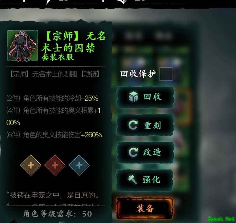 通过谢园的疯狂医师副本,利用SL技巧反复刷取,大约200次可稳定获得两件套宗师装备。