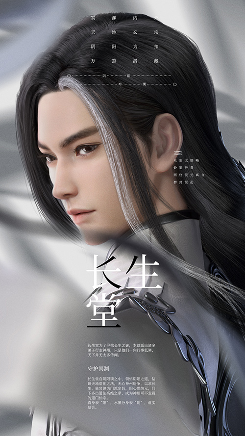 长生堂信奉“阴阳壹体,道用无穷”,拥有强大的控制之力,其术法以天地元素为引,相互转化变化多端。门内弟子有着专注内敛、自律而克制的宝贵品质,形象上皆以阴阳太极为意,于黑白中尽显长生之道。