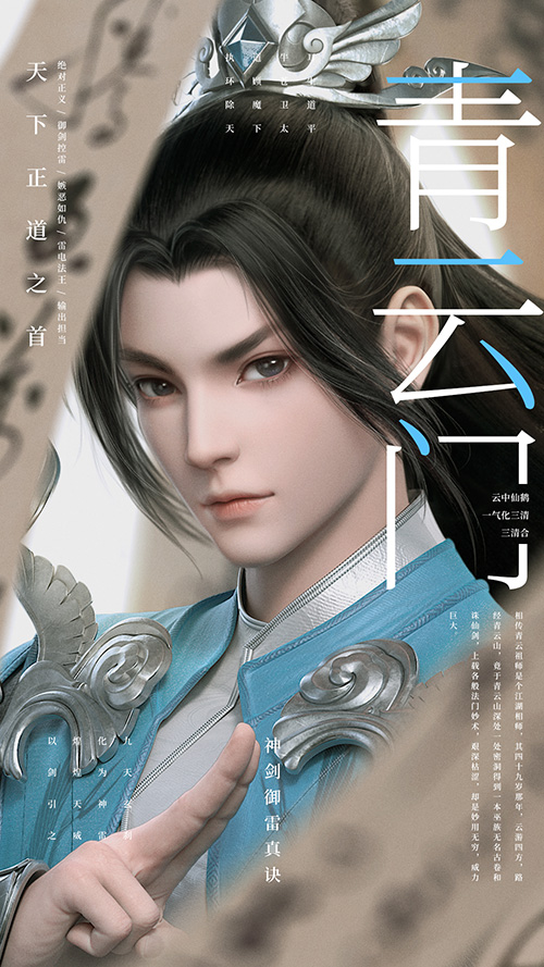 青云门被誉为天下正道之首,修习控雷御剑之法,擅长群体输出,其无上心法太极玄清精妙绝伦,镇山奇术神剑御雷真诀更是威名赫赫。本门弟子以降妖除魔为己任,大多佩剑修行,以身御自然造化,以术引雷云电闪,形象上极富少年意气,更显青云心性坚毅之感。