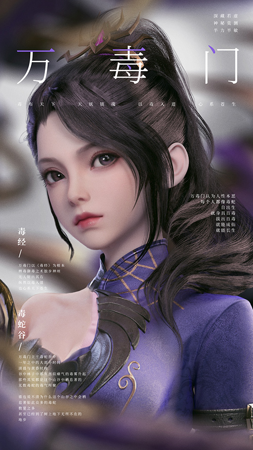 万毒门位于迷雾重重的毒蛇谷,门派功法剑走偏锋,以毒入道,身法快、准、诡、绝,一旦命中非死即伤。门派奉《毒经》为圣,门人勤耕不辍,钻研拓展。其形象孤绝诡秘,行走于神州,不可滥杀,也不可不杀。