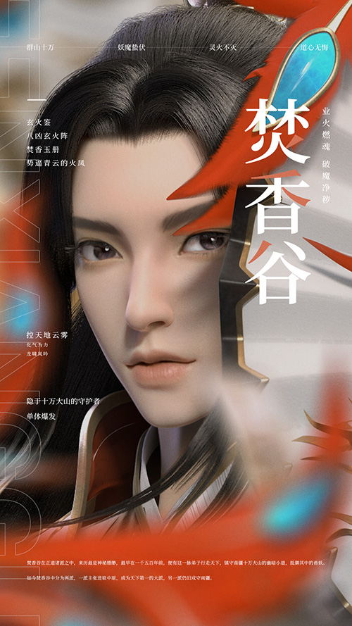 焚香谷镇守南疆十万大山的幽暗小道,以镇派神器玄火鉴闻名。门派信仰火神,修行强大的御火之法,形象取赤炎之精美,似飞天火凤英姿飒爽。焚香来人多性情刚烈,热情爽快,以炎阳之力斩世间妖魔。