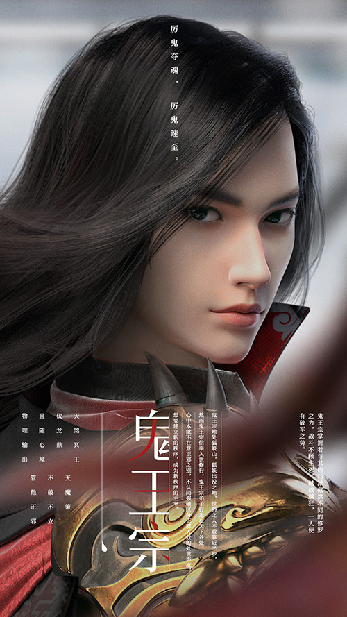 鬼王宗功法霸道深厚,以物理输出为主,所修之人身形迅猛,亦可力震山河。门派男女性情豪爽不拘,如磐石缠丝,外刚内柔,形象上既有少年人的张狂霸气,眼中却含万缕柔情。