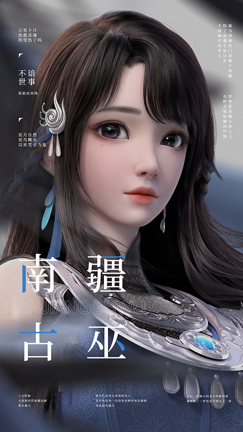南疆古巫自上古传承至今,前有巫女玲珑献身以报天下,后有璇玑传神器保神州。南疆向往日月星辰,崇尚自然,擅长祝福、生命之术,族人质朴恬淡,有上古遗风,透露天地之美。