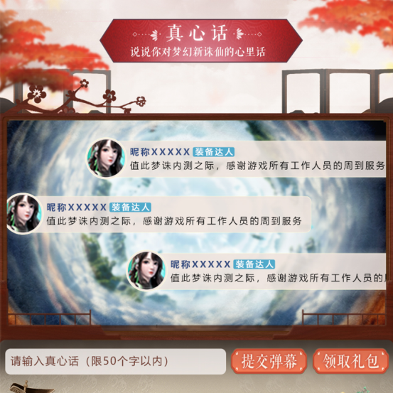 真心话:本次“明星招募团”活动中,诸位道友可以在专题页留下自己对《梦幻新诛仙》想说的心里话,成功发布后,即可领取【真心话礼包】