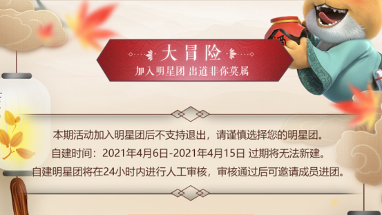 大冒险:在招募本次活动中,玩家可以选择加入或者创建一个明星团,但明星团一旦加入就不支持退出;自建明星团也有着一定的时间要求。你敢不敢来一次没有回头路的大冒险,和你的团员一路走到最后?