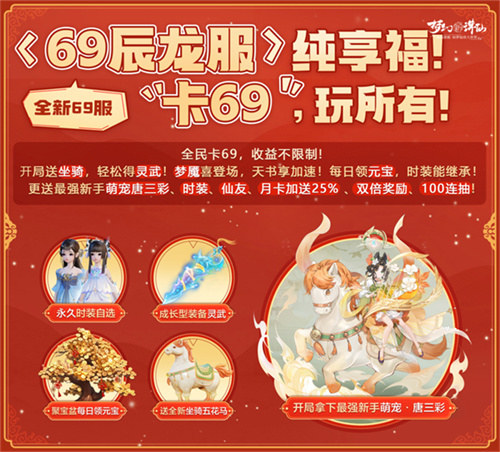 为了让更多道友纯享梦诛,全新纯享服<69辰龙服>它来了,现已正式开启预创角!全新纯享服<69辰龙服>,现已正式开启预创角!灵武、唐三彩、五花马,开局就能有!全民无级别成长型装备「灵武」登陆<69辰龙服>,更惊喜的是,灵武可以自由变幻装备部位、属性,支持道友培养特技、特效!道友可前往新服进行体验!登录就送「唐三彩」、「坐骑·五花马」;3倍天书灵气、5折洗灵丹、月卡加送25%元宝诸多福利加持,现在加入神州浩土先人一步,再也不用担心开荒进度!