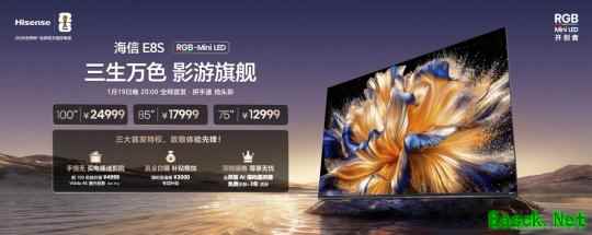 1月19日20:00,海信E8S已在海信官方商城、京东、天猫、抖音等主流平台正式开售。