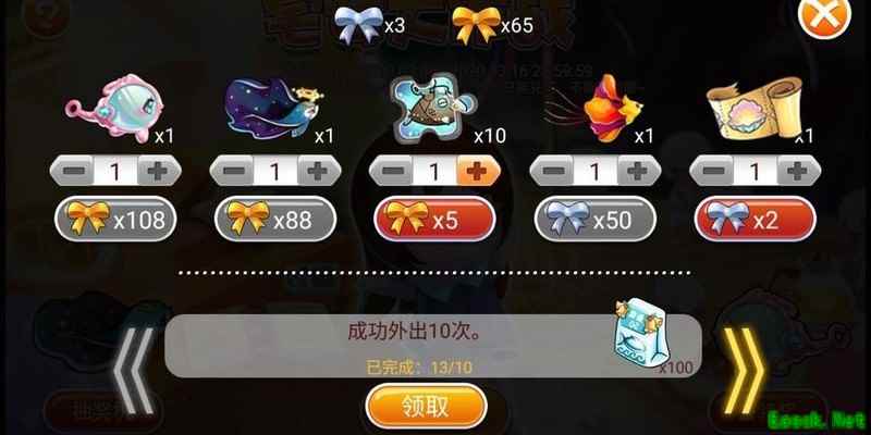 一圈结束后,共获得65个金蝴蝶结、3个银蝴蝶结和12颗爱心。由于偏爱新鱼并希望开启宝箱,主要通过拆信封获取金币,因此金色奖励较多。