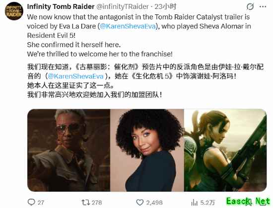 曾饰演《生化危机5》中谢娃和《街头霸王》中埃琳娜的伊娃·拉·戴尔确认,她将为《古墓丽影:天灾》中的角色配音。本人在与粉丝简短交流时透露了此消息,但未具体说明其饰演的角色细节。