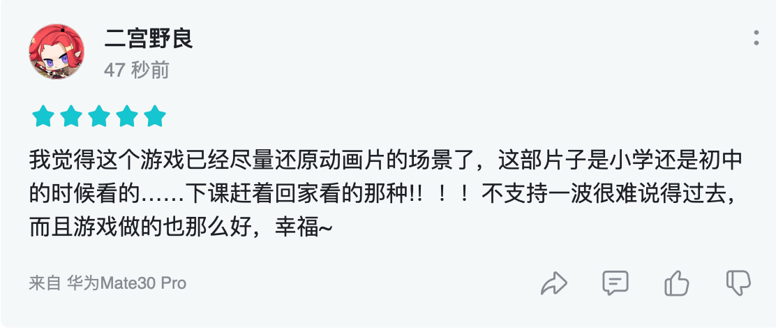 游戏上线后,在TapTap评论栏中,大多数留言有鼓励及赞扬向内容。游戏备受好评的关键点在于还原度,不少玩家感叹游戏完成高的同时,对经典场面的还原也是十分到位,“爷青回”、“童年回来了”这种词语每一页都能见到几个。