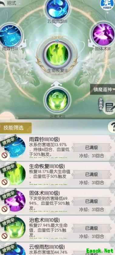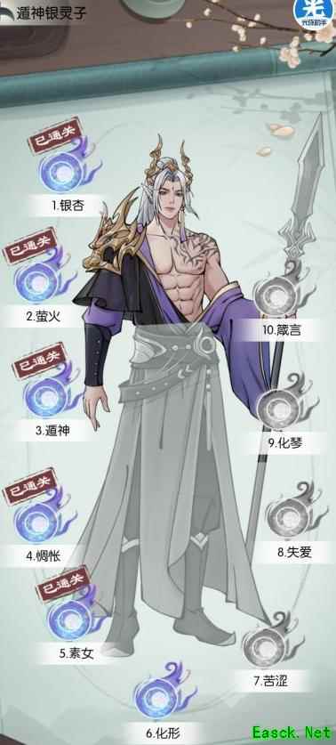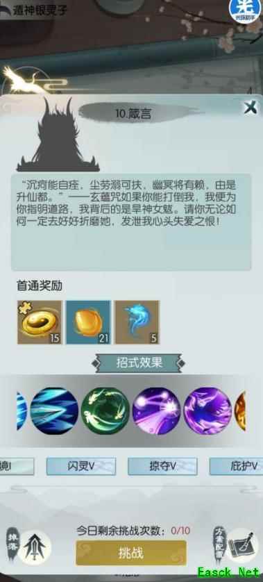 所示,银灵子第一关与第十关的招式和词条相同,但词条等级随关卡提升而增强,每两关升一级,第九、十关除梦境外均为五级。