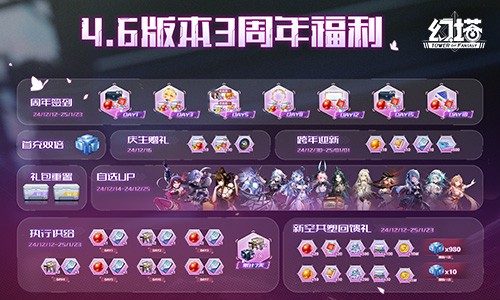 紧张刺激的周年签到活动即将上线,另有幻塔三周年“40连自选限定抽卡道具”、“庆生赠礼”福利活动、“跨年迎新”福利活动,和大家熟悉的版本回馈礼包、执行供给、首充双倍、新手补给等等礼包重置。“塔的三岁”,真的准备大办一场!