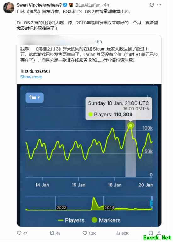 《博德之门3》的开发商,Larian Studios的负责人Sven Vincke亲自在X上评论了这一佳绩,证实《博德之门 3》的销量仍处于 “难以置信的高位”。此外,《神界》新作的官宣,进一步带动了这款过往爆款的热度。