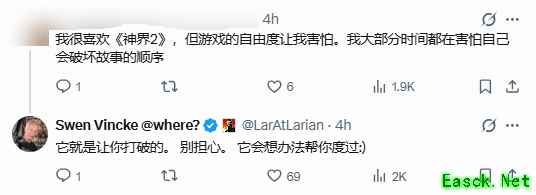 有粉丝在本篇的评论区中表示,担心在Larian的游戏中,自己的自由行动会“破坏故事的顺序”,Vincke则表示“剧情就是用来被你们打破的。别担心,游戏会找到办法带你们继续前行”。