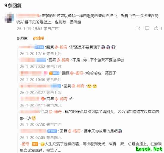 随后在评论区,杨奇本人回复了许多网友的消息,其中还特别提到了《黑神话:悟空》中曾被许多人诟病的“空气墙”:人生充满了这样的墙,每次看到亮光,纵身一跃,总是会撞上。在游戏里尝试复现过,被骂了...