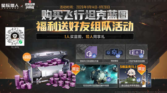 与此同时,篝火舍小程序将开设“购买飞行坦克蓝图福利送好友”活动,购入蓝图或参与组队的玩家有机会享受海量福利回馈。