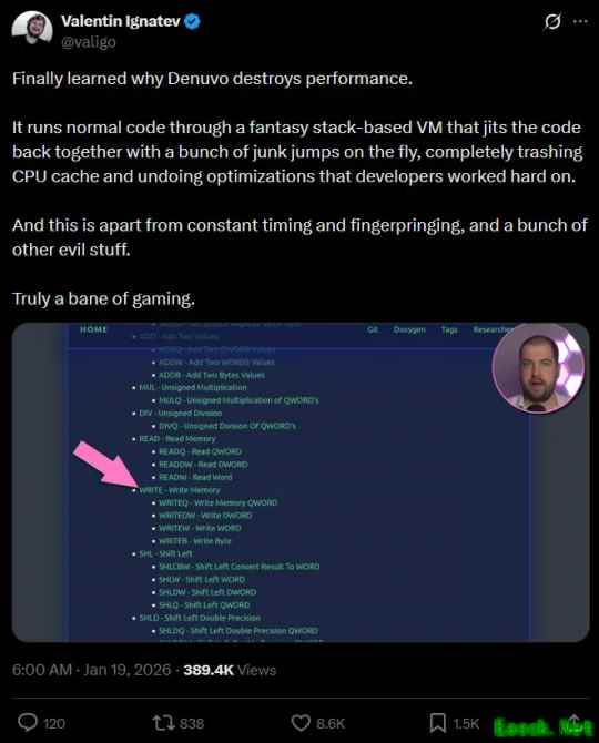 根据博主Nathan Baggs的分析以及程序员@valigo在社交媒体上的佐证,Denuvo的核心工作原理是:它将游戏的部分关键代码包裹在一个自定义的虚拟机中。原本为CPU高效执行而优化编译的指令,会被转换为此虚拟机特有的指令集。