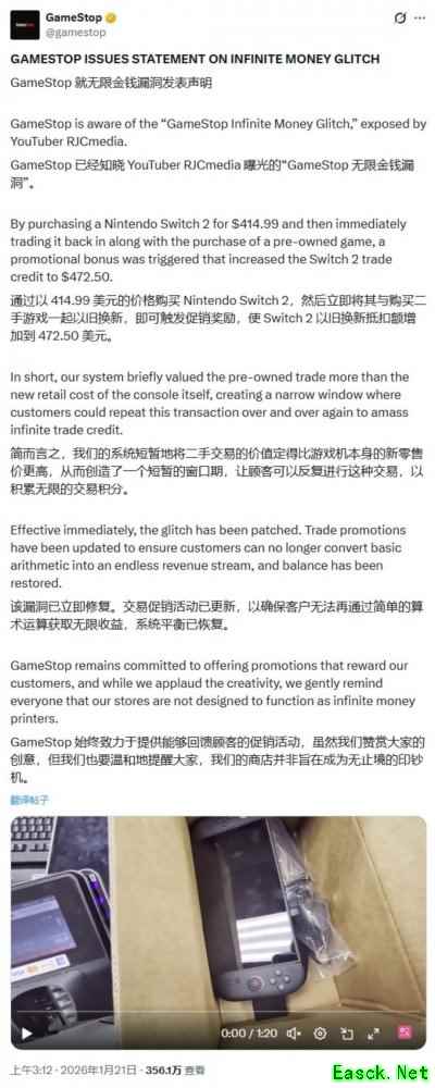 随着该“无限赚钱漏洞”在网络上引发热议,GameStop迅速做出反应。其在1月21日发布的声明中,以充满游戏术语的幽默口吻承认了RJCmedia所报告的漏洞,并表示由于促销活动计算错误,导致短期内二手商品的回收价一度高于新品售价。公司宣布已“应用补丁”修复此问题,使“游戏平衡得以恢复”。