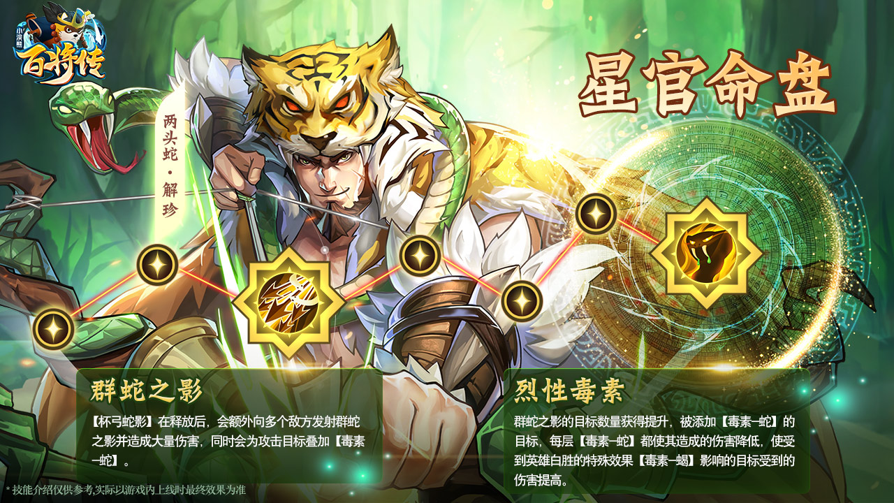 解珍点亮完整命盘后,就可以激活【烈性毒素】,激活后,【毒素-蛇】技能效果会进一步获得增强!还可以与英雄白日鼠·白胜技能产生连携技,打出更高的伤害哦!