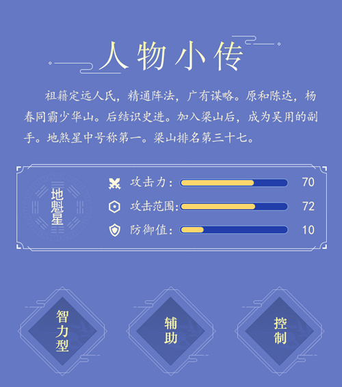而在游戏中,朱武虽是地煞,但也绝对值得培养。和在《水浒传》中的神机军师的定位相似,朱武是一名非常百搭的英雄,善用阵法来提供增益,并在长线战斗中有独特优势。搭配输出能力超群的英雄,朱武定能为他们保驾护航,过关斩将。
