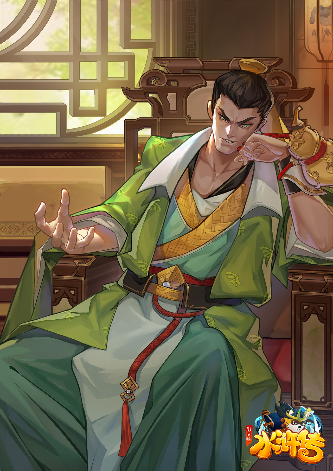 没遮拦•穆宏身穿宽袍大氅,漫不经心的把玩酒葫芦,颇有玩世不恭的神韵,唯一可惜的是背景太过于单调,让这张水浒卡整体的观感稍显不足。