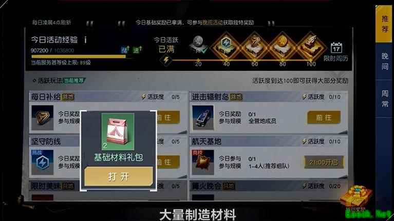 每日活跃奖励可通过完成大世界中的日常任务获得,累积活跃度后开启对应宝箱,即可领取丰厚的制造材料,助力角色成长与装备打造。