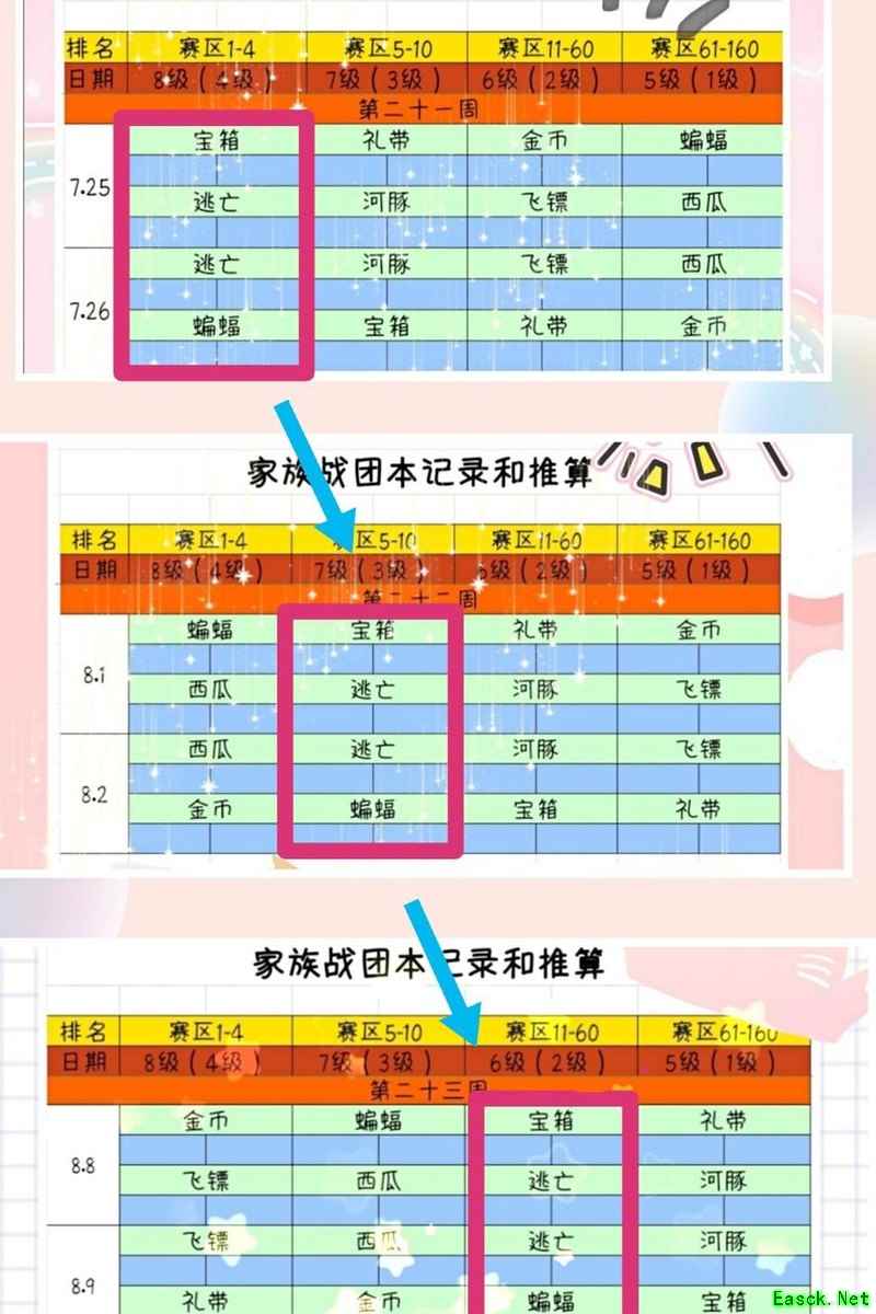 当天家族战的一团与上次的二团相同,而当天的二团则按图示顺序依次类推延续下去。