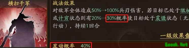 横扫千军的触发机制与陆逊相似,需在敌方已有负面状态的基础上进行概率判定。假设敌方三人全部处于缴械或计穷状态,计算其最高触发概率,则横扫千军的震慑几率区间为0%至26.3%。