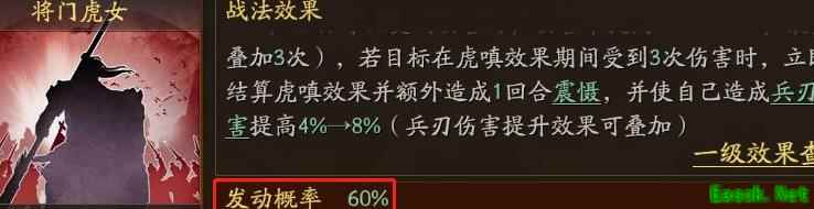 关妹的主战法将门虎女在理想条件下震慑概率可达最高。配合踩踏马与青州兵,虎嗔效果通常能迅速叠满,除极少数未能叠满导致效率为零外,其余情况下其震慑触发效率基本稳定在60%的战法发动概率上。