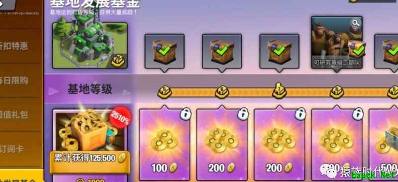 基地共30级,每升一级可领取发展基金中的宝箱奖励。