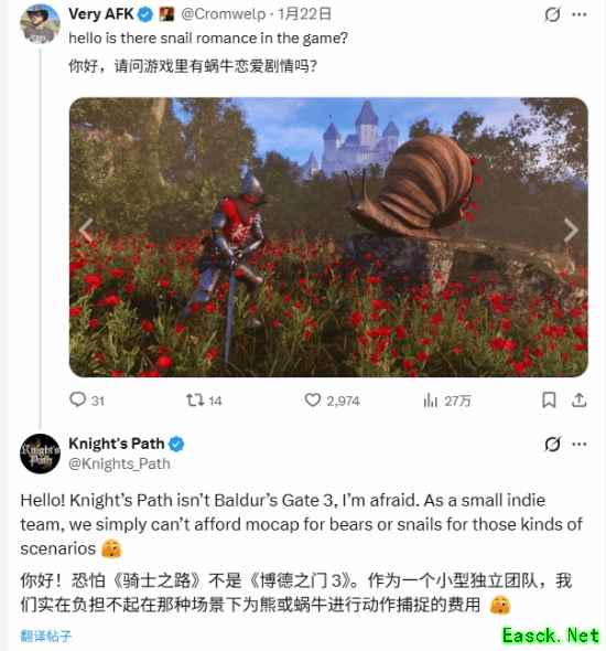 拉瑞安工作室发行总监看到讨论后加入话题,还玩起了梗:“请问能在这款游戏里和蜗牛谈恋爱吗?” 这个玩笑不仅关联一张主角大战蜗牛的游戏截图,更暗戳戳致敬《博德之门 3》里和熊恋爱的奇特剧情,还精准拿捏了《骑士之路》拒绝非传统恋爱线的立场。