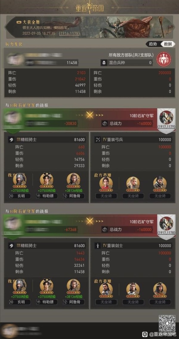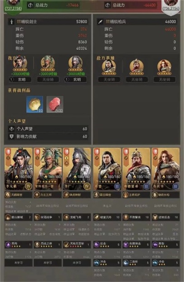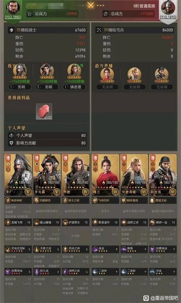 通过这位玩家的测试可见,李广转剑搭配秦叔宝+李元霸,不论是主将位还是副将位,都有非常不错的表现。