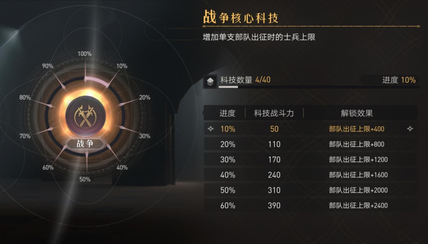 科技升级优先战争页,升级主副队兵种科技,发展方略优先兵种攻击、训练速度、治疗速度,以短时间高收益为优。