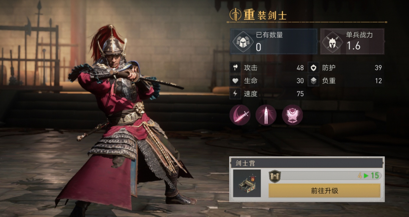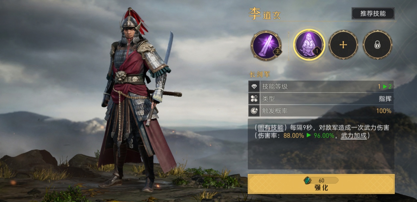 他的上阵主要是为之后指挥剑做提前准备,初期阶段可装配三星技能二连斩或冲击;四星技能可选择反击、列阵御敌等输出向。