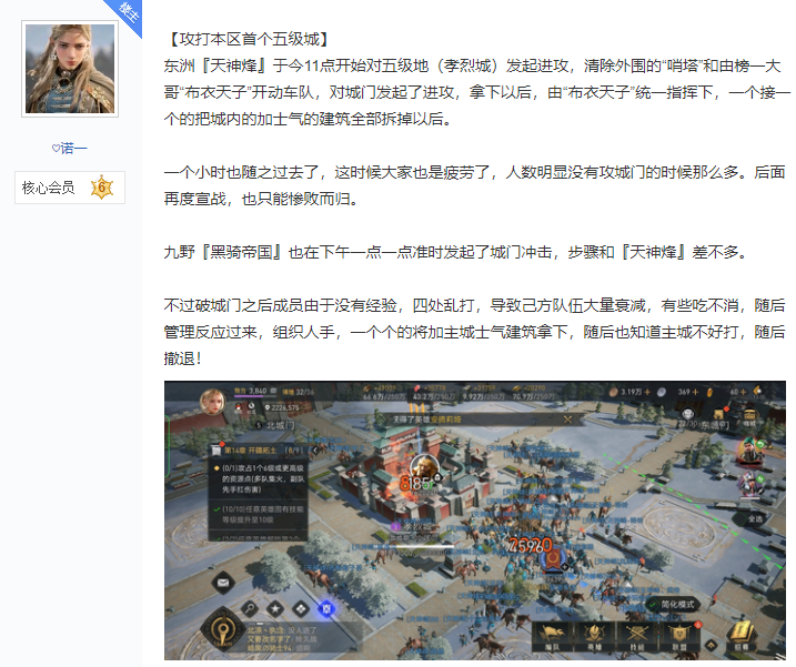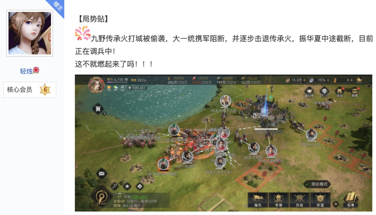但在笔者翻阅《重返帝国》的史官记录帖时发现,基于游戏主打的活战场活策略玩法,史官内容也发生了变化。他们不再只聚焦于战役重要时间点和对应结果,而会把战场上发生的每个精彩瞬间都记录在册,因此这些帖子不像“史书”,更像是文字版的战地直播。