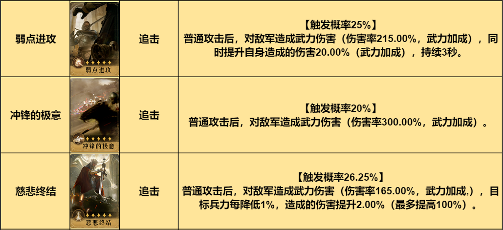 其本身拥有一瞬七击的高爆发主将技,且固有技能东洲龙影在提升全属性的同时,还有30%概率无视对方60%防御,因此首推冲锋的极意、弱点进攻、慈悲终结等输出型追击技能。(如下图)