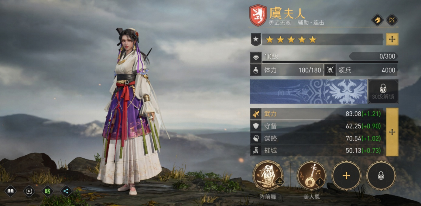 虞夫人:同为勇武无双,且拥有骑兵专精,她的固有技能美人恩可以使下一名英雄进入连击状态,且提升对方的武力值,可以在前中期顶替假面将军的位置。