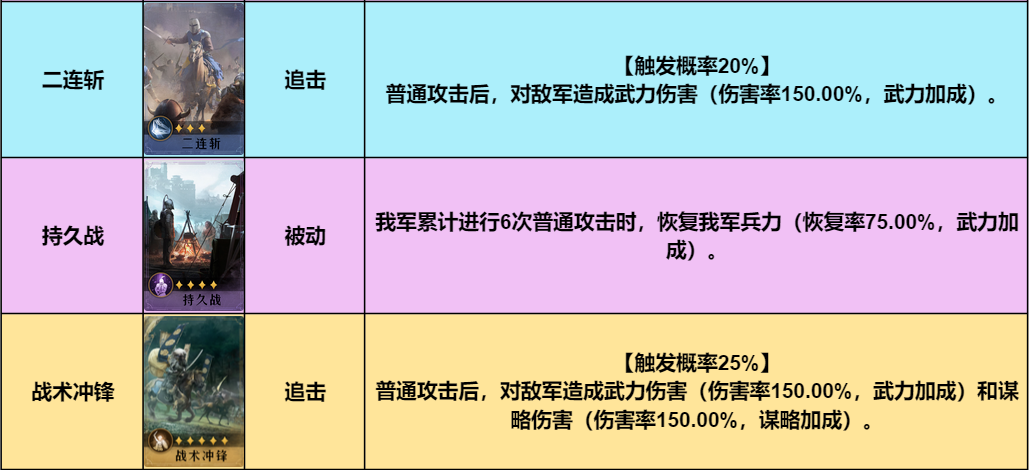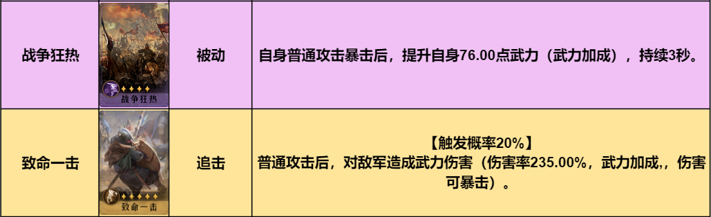 由于主将技和固有技能自带暴击,因此紫色技能战争狂热非常契合,可暴击的致命一击为最优输出技能。(如下图)