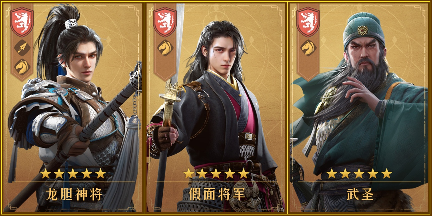 英雄获取方式除招募之外,龙胆神将可从霸业宝册获取,武圣可通过首冲获取,假面将军可从东洲龙影卡池招募。(如下图)
