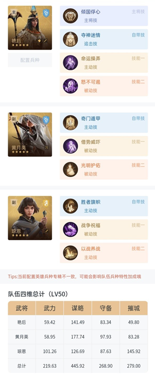 首先明确一点,这是一套野战辅助阵容,主要作用不是打伤害而是限制敌方的输出能力。弄清楚定位之后领主大人们就可以自行尝试搭配技能了。